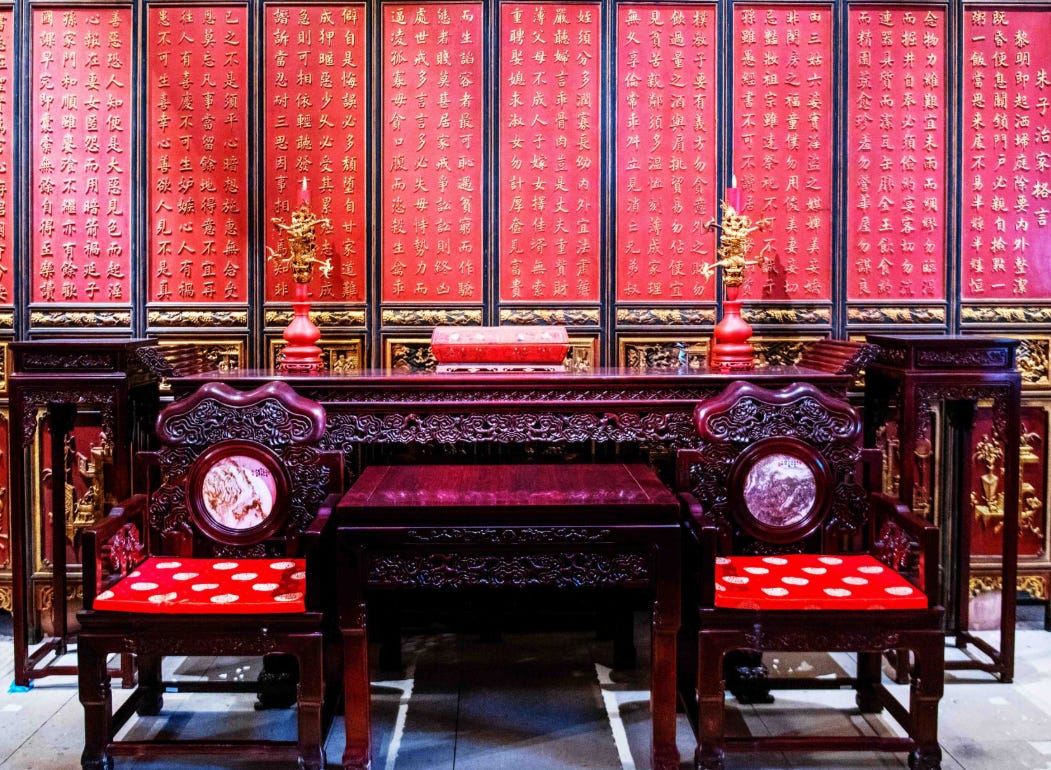 回去这户人家,已经轮到我们进屋。这户人家二层楼,加起来二百平方米左右,据说是华人,有许多广式红木家具,一些出口创汇期的瓷鼓凳,价格也不便宜。很难想象这户并不特别富裕的家庭中,怎么会有如此珍贵的龙袍和蟒袍呢?