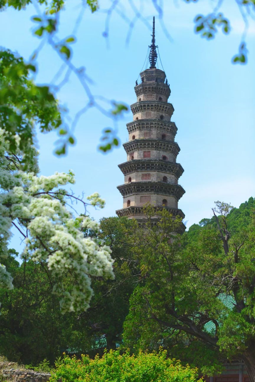 人间四月天,一树流苏掩映下的辟支塔高耸入云,塔基浮雕清晰可辨,详述孔雀王朝阿育王皈依佛门的故事。千佛殿屋顶的罗汉像威武雄壮,代替骑凤仙人居于檐角。今日宜祈福。