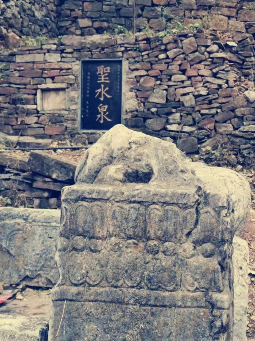 十月,乔老携三五师友访仲宫普门寺遗址。穿过石砌的村居,拾级而上,曲径通幽,两棵雌雄伴生的古银杏树映入眼帘,一青一金如鸾凤,如羽如扇飘然落。普门寺早已无踪迹可循,只有一处圣水泉,亦名圣池泉,是七十二名泉之一。《济南府志》载:“圣池泉在普门寺山门外,清冽澄洁,一方攸赖。”池为石砌,石栏雕刻精致,泉水清澈见底。俯身汲甘泉,涓涓甘露润,滴滴醍醐凉。携得青友来,同凤会清风使。