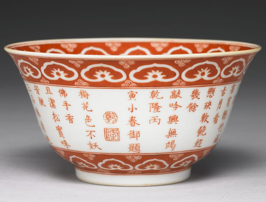 三清茶是乾隆皇帝创制的宫廷饮品,以龙井茶为基底,配以梅花、松子仁及佛手柑,采用雪水烹制而成。该茶饮自乾隆八年(1743年)起成为重华宫茶宴的核心元素,还有品茗赋诗活动。乾隆命人制作了镌刻御制诗的专用茶具,青花描红茶碗。台北故宫博物院藏青花描红御制诗茶碗,内壁绘梅、松、佛手纹样。松、柏寓意社稷稳固,梅花象征文臣气节,佛手谐音“福寿”。外壁书乾隆《三清茶》诗文:“梅花色不妖,佛手香且洁。松实味芳腴,三品殊清绝。烹以折脚铛,沃之承筐雪。火候辨鱼蟹,鼎烟迭生灭。”