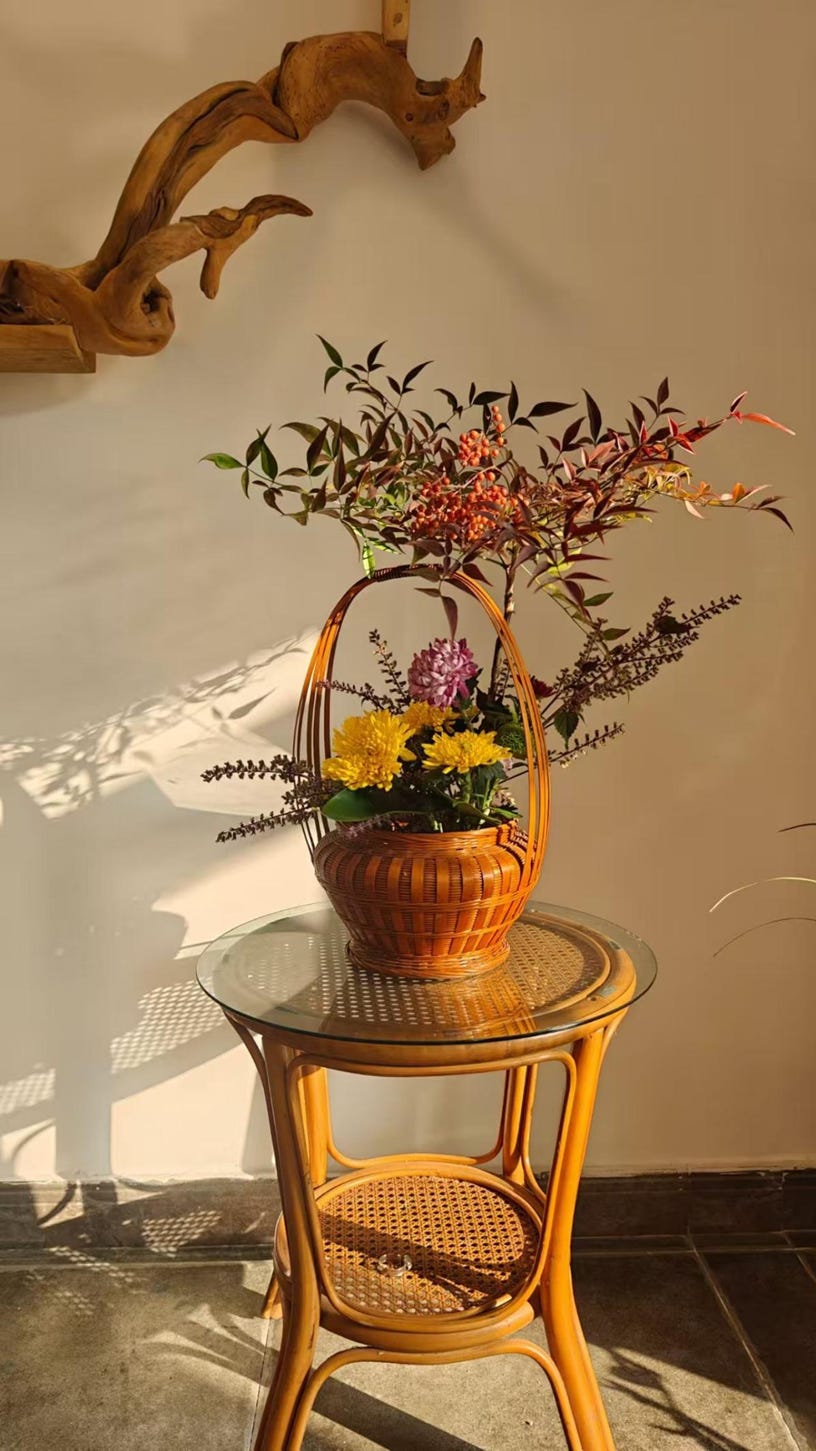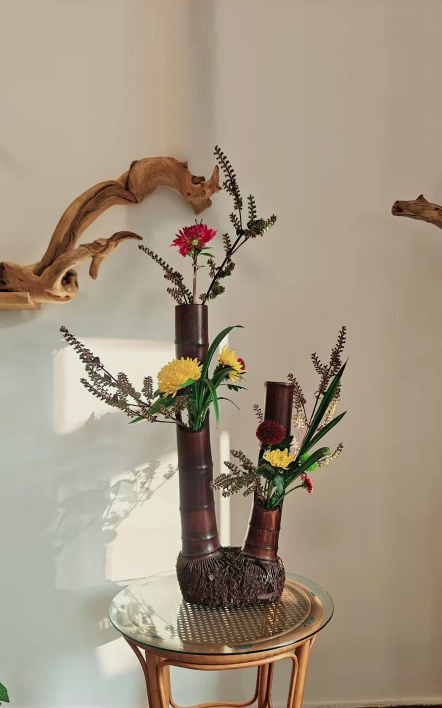 乔老持竹筒为器,插以山野之枝,茶席复增韵。余亦插作篮花、筒花,以清供。