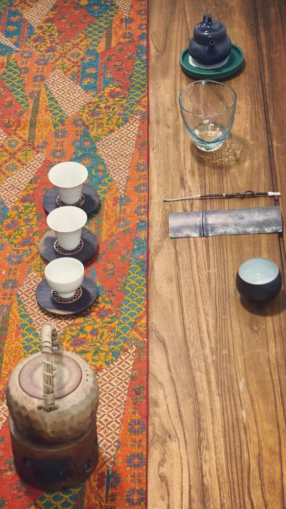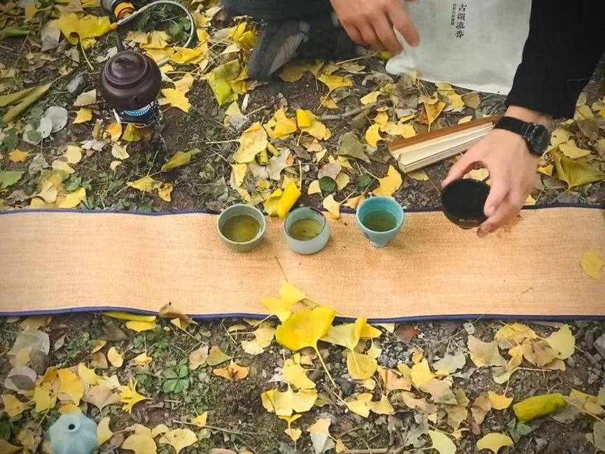 常慕古风烹野茶,今与茶人叁生在一棵合抱粗的银杏树下盘坐,晏坐自清安。以秋叶布茶席,满目青黄。将泉水注入茶壶,小炉喷吐着篮焰,紫砂红泥煮嘉叶,待茶汤鼎沸,如兰隽永幽幽香,才遇苦口师,又见余甘子,真如自性自在尝。