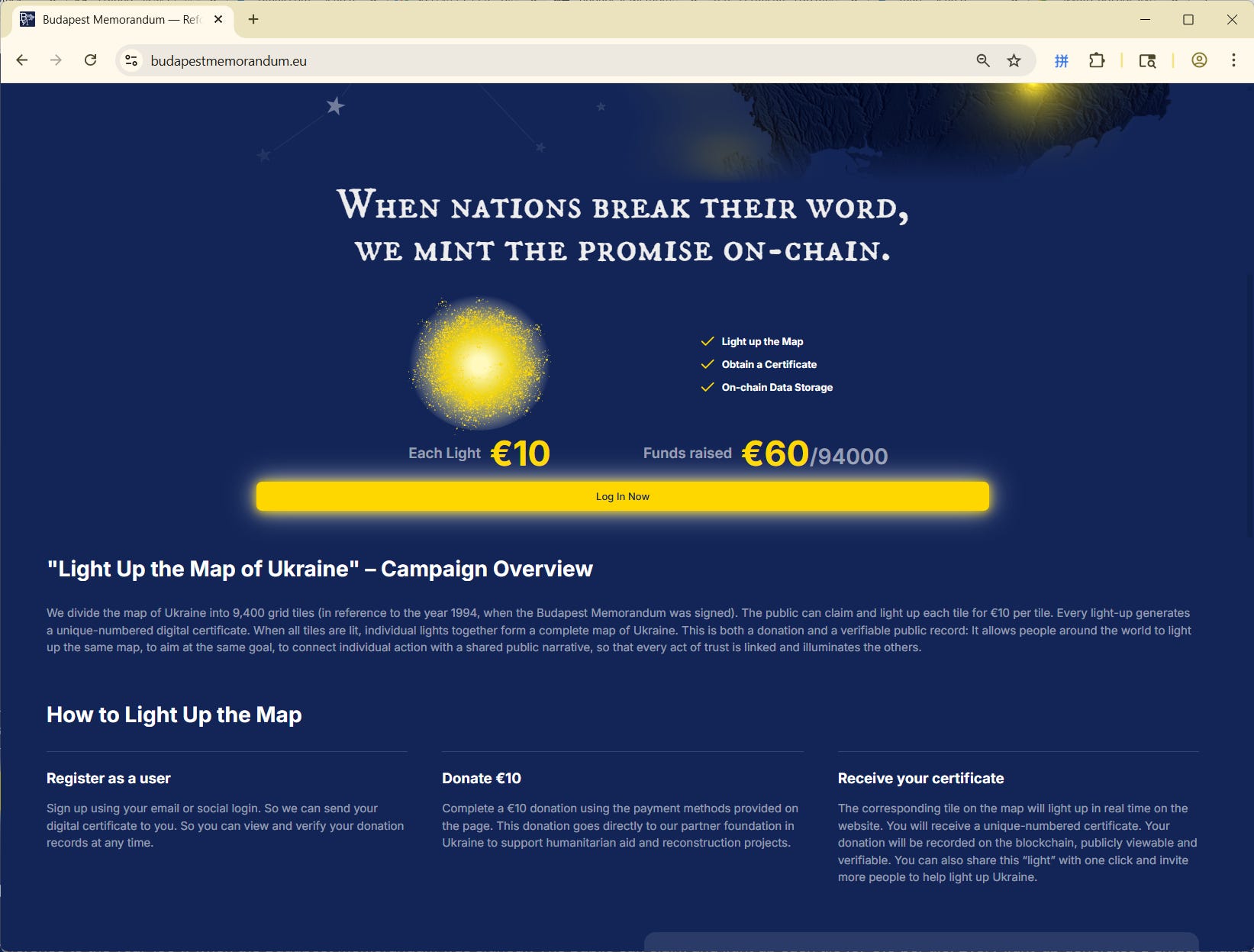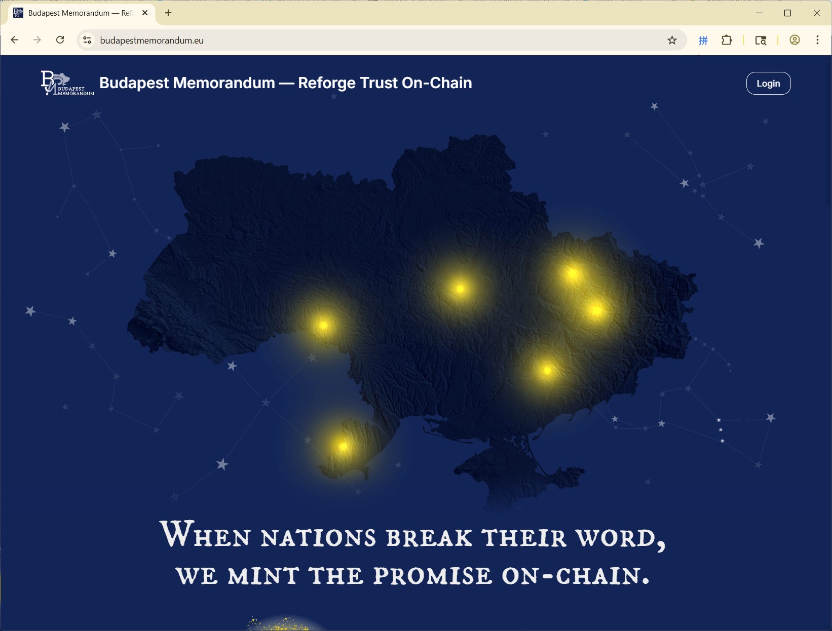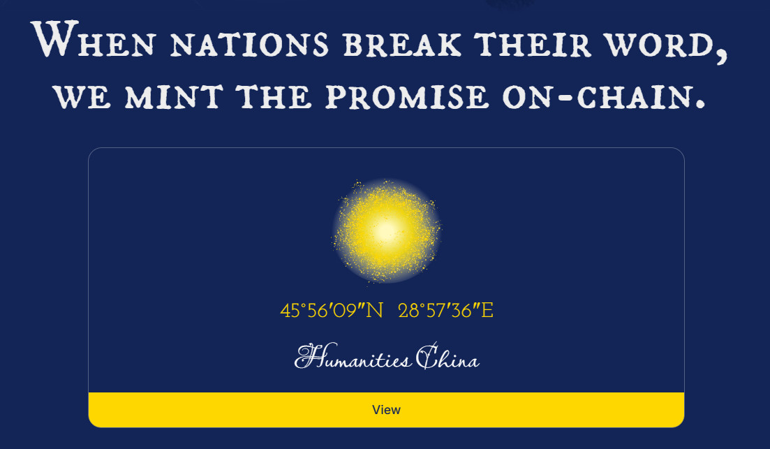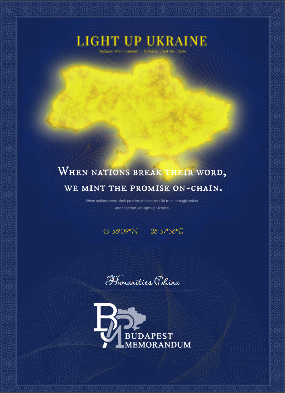 在大国曾经信誓旦旦承诺保护乌克兰安全的《布达佩斯备忘录》签署纪念日12月5日,该活动的官方网站Budapest Memorandum — Reforge Trust On-Chain已告正式上线。《人文中国》编辑部随即对网站进行了测试,并在乌克兰地图上点亮了一粒微光。